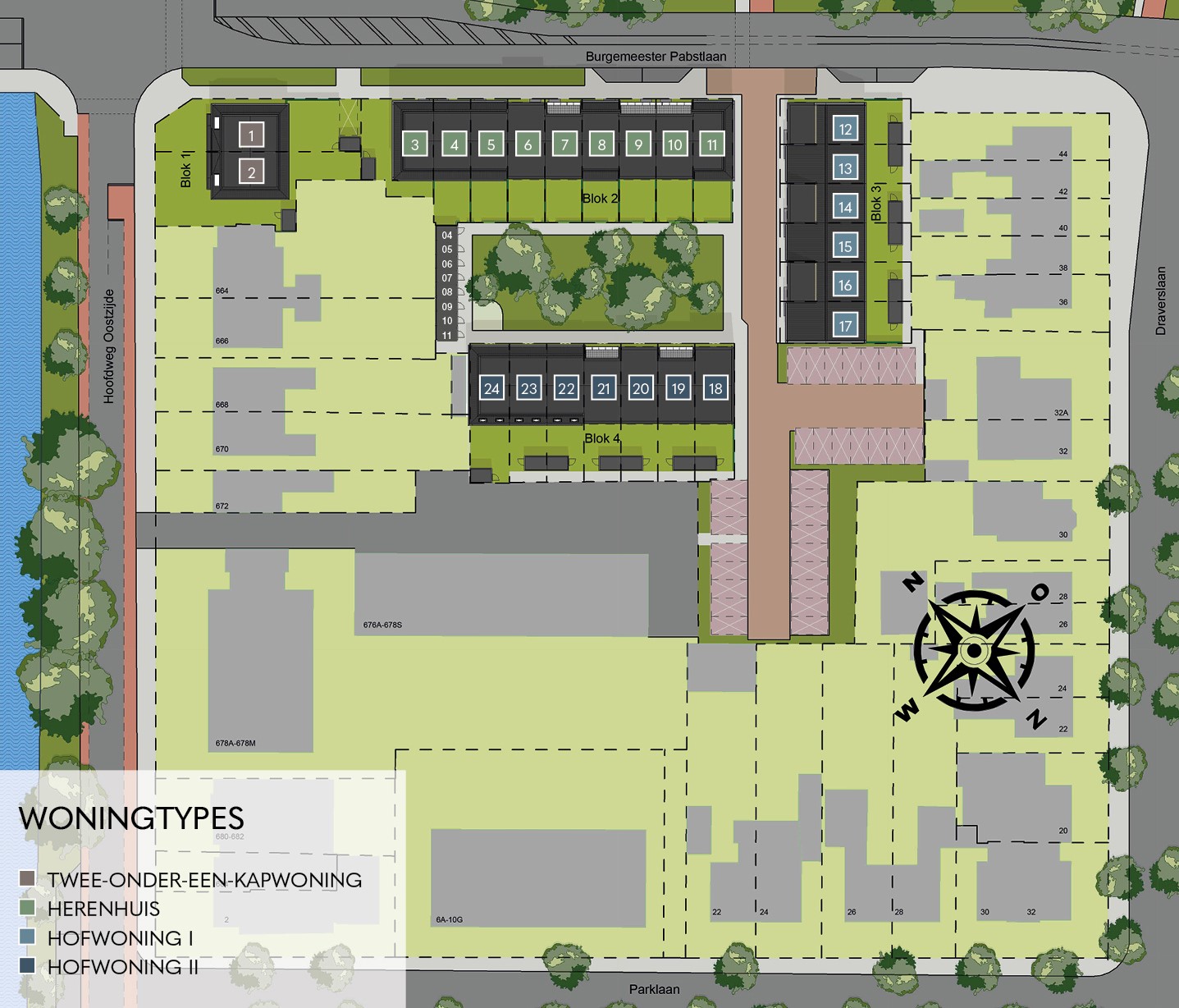 Aan parkeren is ook gedacht. De parkeerplaatsen zijn in de parkeerhoven en daarmee zoveel mogelijk uit het zicht. En ook voor parkeren door bezoekers is voldoende ruimte aan de Burgemeester Pabstlaan.